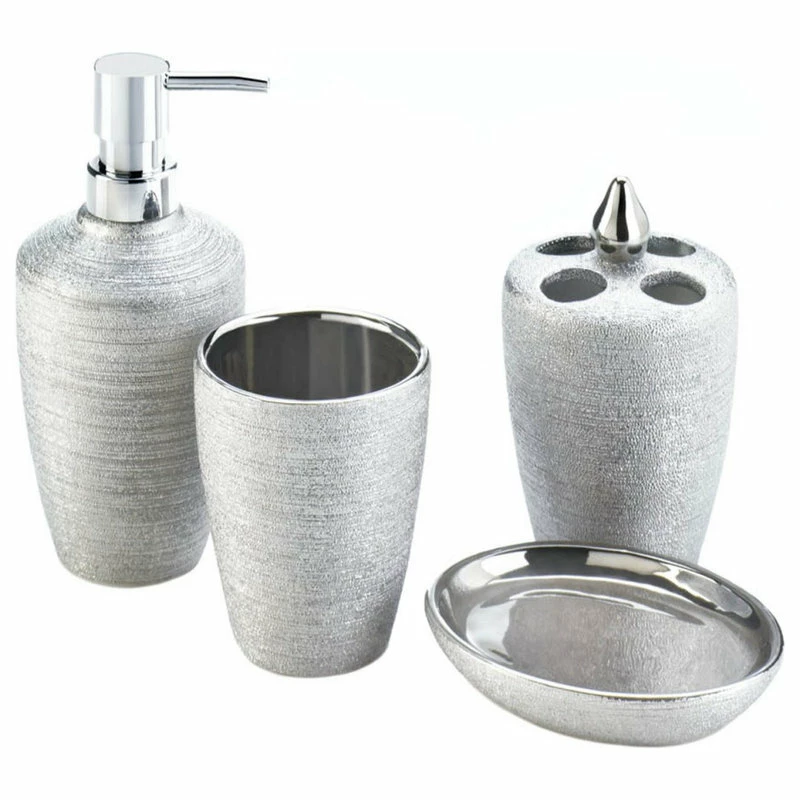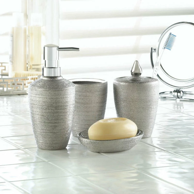 SILVER SHIMMER BATH ACCESSORY SETYour bathroom counter will sparkle and shine with this luxurious 4-piece set. It comes with a liquid soap dispenser, four-slot toothbrush holder, cup, and oval soap dish.
