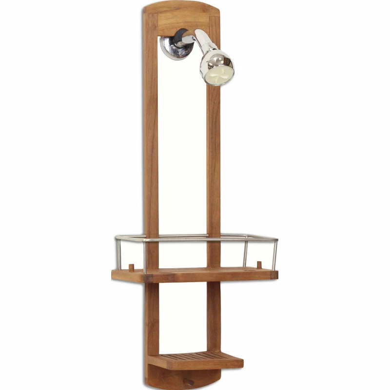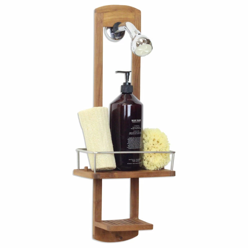 This beautiful AquaTeak® shower organizer fits perfectly on your shower head and provides a spa-like elegance to your bathroom without sacrificing convenience. Though small and space-saving, this teak shower caddy includes plenty of room for toiletries, and features a large shelf with stainless steel molding as well as a smaller shelf that is the perfect size for soap or a razor. No mounting or hardware required for this teak shower organizer, just hang and use! Each of our products comes with a 30 day satisfaction guarantee and 5 year warranty.