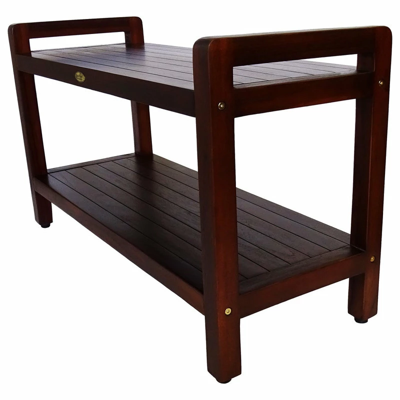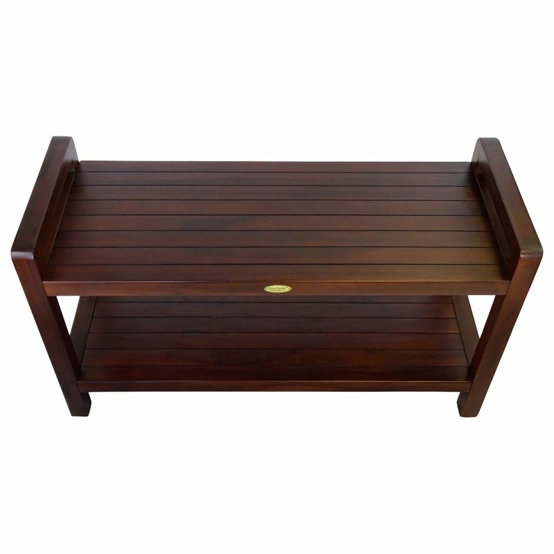 DecoTeak LiftAid ergonomic shower bench provides a combination of comfort and elegance to your shower, bathroom, patio, or living area. Arrives pre-stained from our factory with a durable indoor outdoor stain with added mildew and fungus resistors in a rich brown tone. Extensive clinical research has shown that by simply providing arms to assist in lifting out of a chair, the added leverage can increase efficiency by almost 200%. The LiftAid arms are designed to be sturdy, and steady to provide that added support and assistance when lifting out of the shower chair. They also provide a handy surface for hanging towels on, and can double as a towel rack once you are out of the shower. An included utility shelf provides additional storage and easy access for your toiletries, or other essential items. Teak is naturally water, mold, and mildew resistant due to its natural density and high oil content. It has been the wood of choice for hundreds of years of luxury boat builders. It provides the ability for this teak furniture to be used outdoors as well as indoors. Please Note: Some Assembly is required