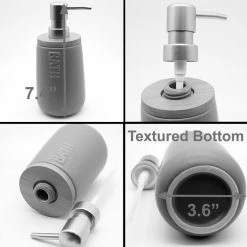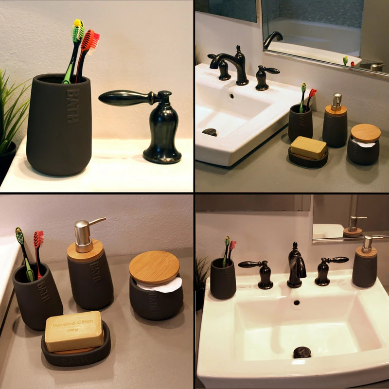 - DESIGNER ARTWORK: Enjoy the unique design of this bath countertop soap and lotion dispenser, outlined with ‘Bath’ in soft focus writing on its side and the addition of a bamboo top which brings a spa atmosphere to your bathroom. Color white, grey or black available