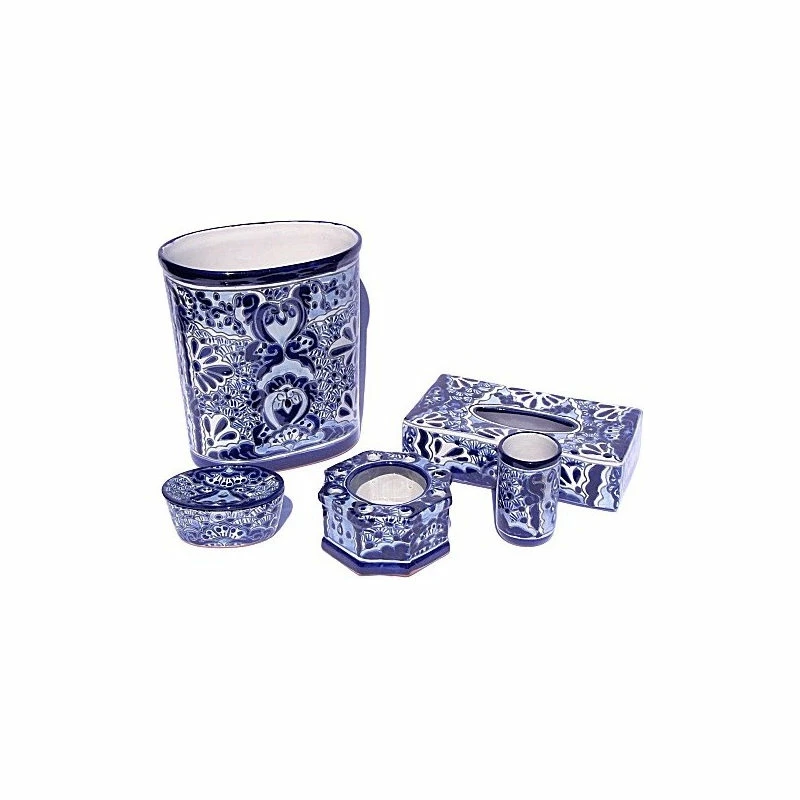 This is a bathroom set in a traditional Talavera (White background and blue decorations) combination. The background is white and the decoration is a soft-blue. The set is composed of a trash can (it measures 10″x6.5″ at the base and is 11″ tall), toothbrush holder, a tissue paper box, a soap holder and a glass. They will enhance your bathroom decoration. Handmade and glazed to preserve it for very long time. Mexican Talavera ceramic is the result of a mixture of cultures over the time. The Spaniards were influenced by Arabic pottery, they brought it to Mexico and the mixture of cultures gave as result these beautiful art in ceramic. This ceramic bathroom set is just an example of the exquisite beauty the Mexican craftsmen put on each item they create. It is handcrafted and hand-painted, which means that no pots are the same! There might be small differences in size, weight and even the paintings. If you want to delight somebody special with an unique handcrafted gift, this is what you are looking for!