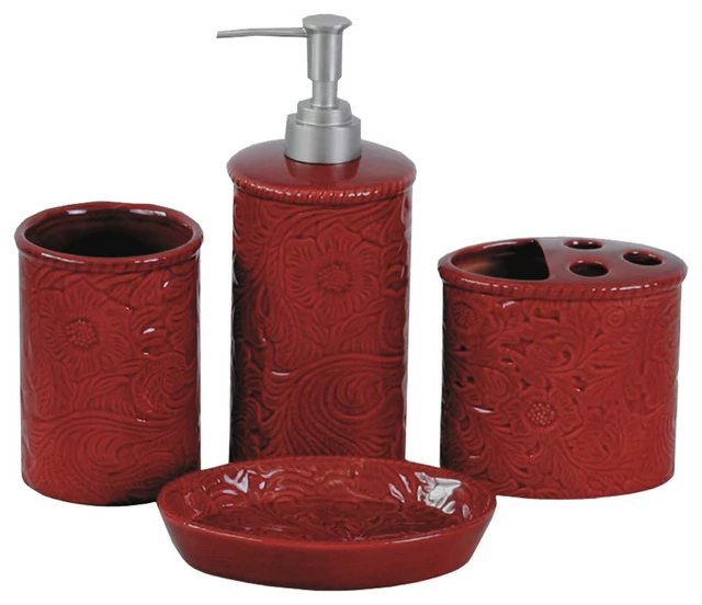 This stunning 4 piece bath accessory set is presented as an extension of the popular Savannah collection which features a swirling floral pattern with a damask flair. These striking pieces, designed to look like hand tooled leather, come in red, turquoise, and mustard,Taupe & Cream Set includes tooth brush holder, lotion pump, soap dish and tumbler