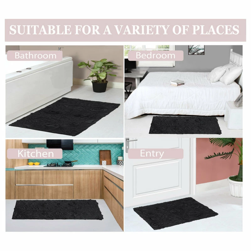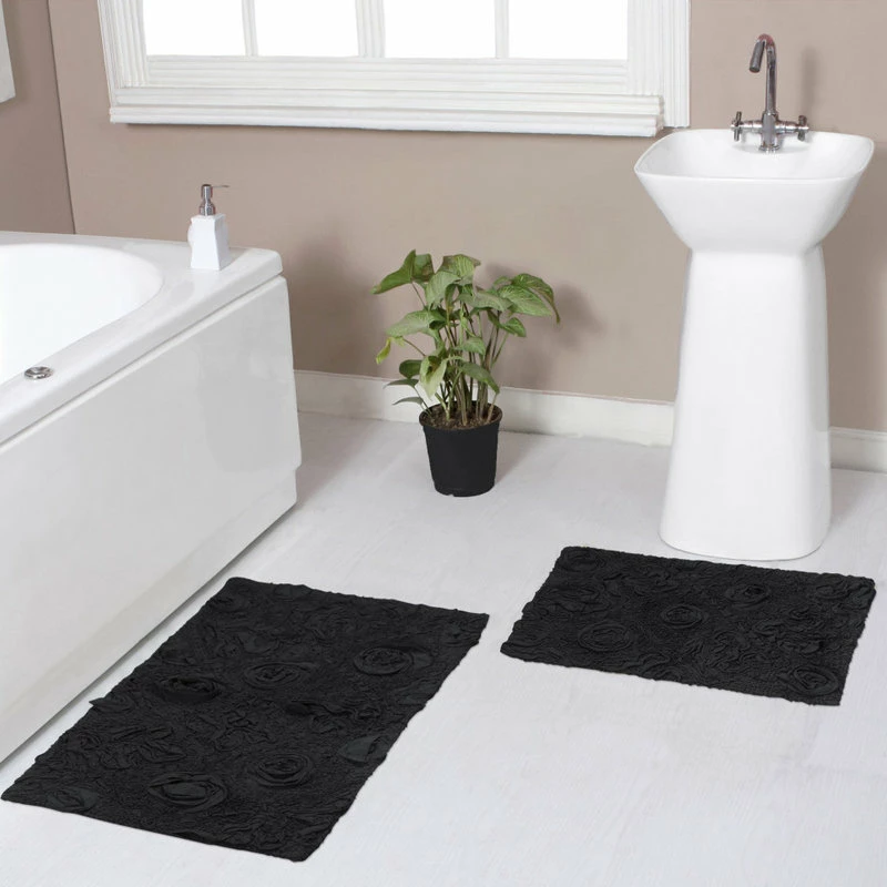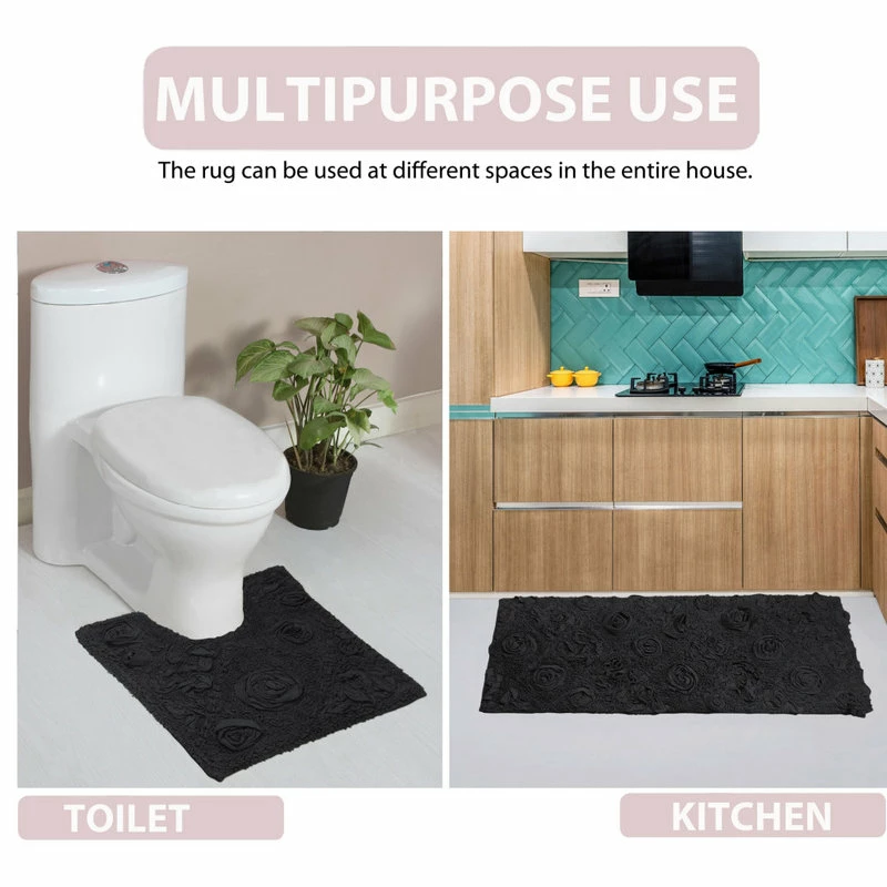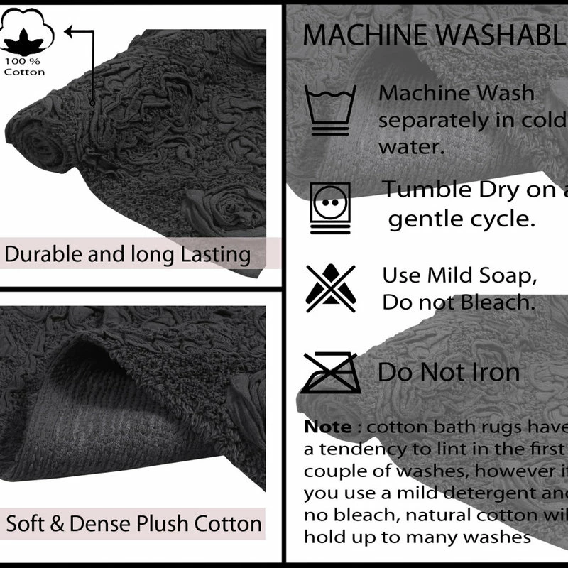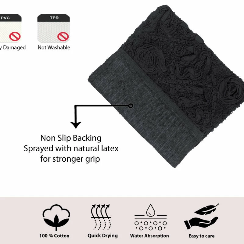 Bring a sense of luxury and elegance to your guest bathroom with the addition of this Modesto Bath Rug. This stunning bath rug features subtle rose designs on bold solid colour background. Soft and durable, it is crafted from pure cotton for exceptional absorbency, thus helping to keep your floor dry after showers. The hand-tufted bath rug comes with a no-slip spray latex backing that helps keep your bath rug anchored to the floor as you step out of the shower or into the tub. Not only does it add comfort and style, but also a soft, absorbent and warm underfoot feel to your bathroom space. It is machine washable, making it easy to maintain. This bath rug is available in 5 different sizes and 6 lovely colours to match your bathroom style and Decor.