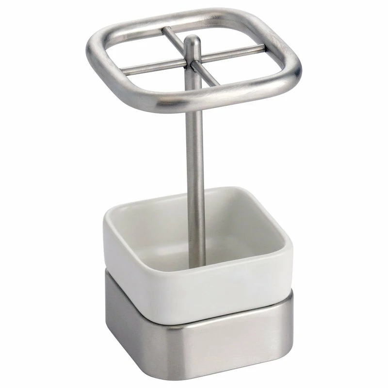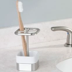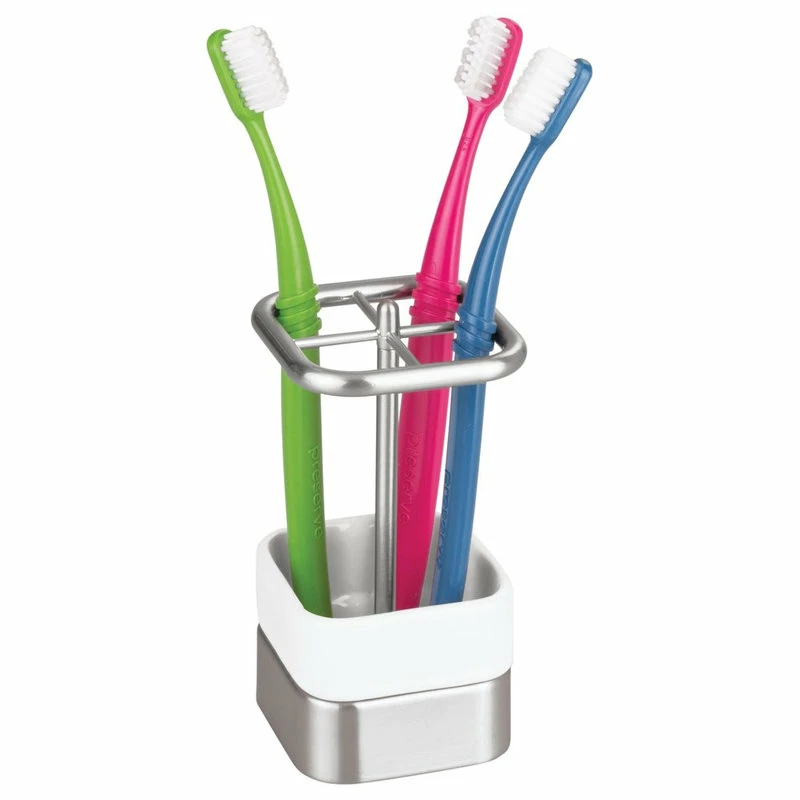 Add style and class to your bathroom with the iDesign Gia Toothbrush Holder! This high-quality toothbrush holder has four slots to fit multiple brushes for your household. The slots are large enough to fit oversized toothbrushes as well. Constructed of durable steel and non-slip base, this holder is easy to clean and will last for years to come! The simple white and brushed design easily matches with any room decor for a cohesive look. The iDesign Gia Toothbrush Holder measures 2.75″ x 2.75″ x 4.75″, fitting perfectly on your counter.