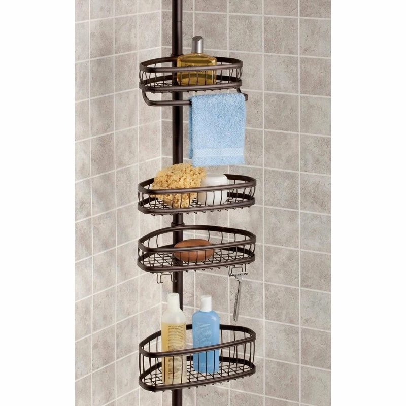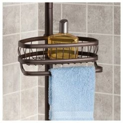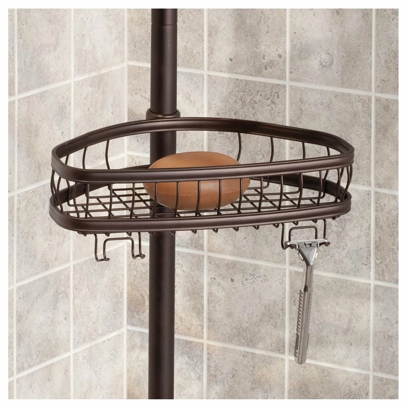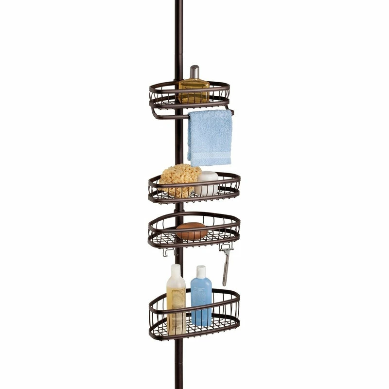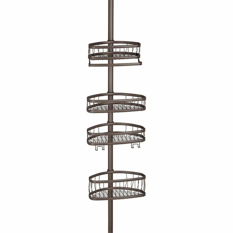 The iDesign York Tension Caddy is perfect for storing all of your shower essentials. This shower caddy requires no additional hardware – simply adjust to your preferred length and lock it into place. This tension pole will not slip, even when supporting your heaviest bathroom accessories. Crafted with steel and a bronze finish, the shower caddy is sure to last for years to come.