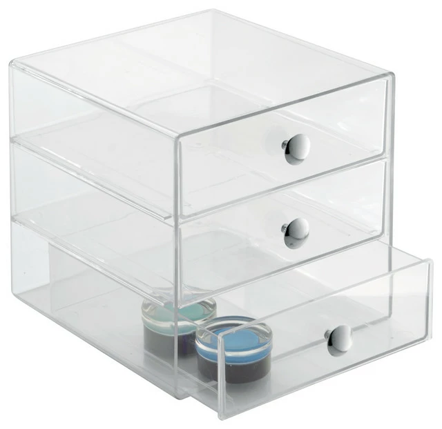 Organizer; Functional and stylish; Ideal for use in the bedroom or bathroom; Plastic; Clear with Chrome knobs; 3 drawers