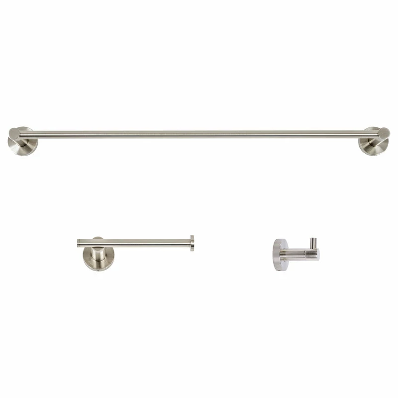 Enjoy a bathroom update with ease, all while saving money with the help of our new Venezia Series bathroom accessory set. This 3-piece set includes a 24″ towel bar, toilet paper holder and single robe hook from one of Italia’s most popular series. All three accessories feature a beautiful brushed nickel finish and our easy install mounting system. You won’t be disappointed with this sleek European inspired set of bathroom accessories. Additional pieces may be purchased individually. SPECIFICATIONS: Material: Stainless Steel. Finish: Brushed Nickel. Towel Bar Dimensions: 3.14 in. L x 25 in. W x 2 in. H. Toilet Paper Holder Dimensions: 3.54 in. L x 5.5 in. W x 2.4 in. H. Single Robe Hook Dimensions: 3 in. L x 1.88 in. W x 1.88 in. H.