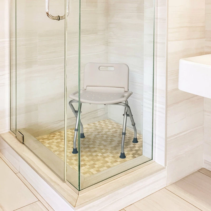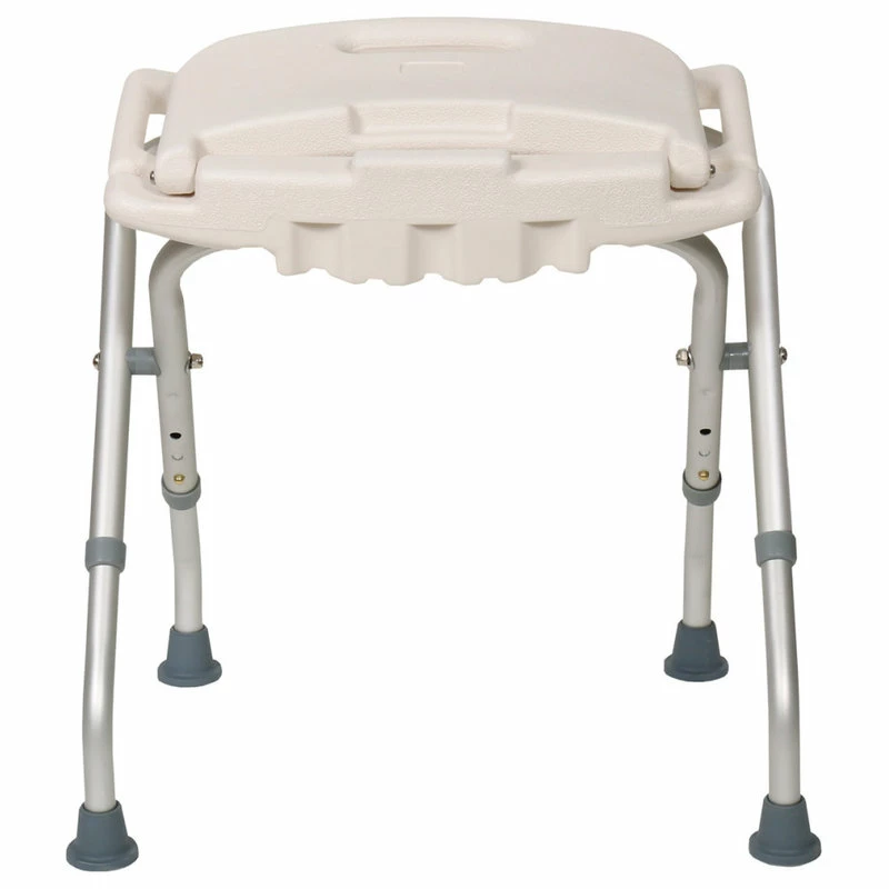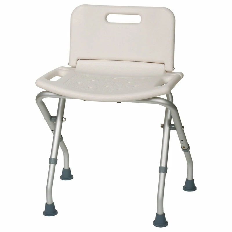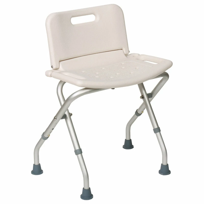 - Ideal for anyone who has difficulty lowering themselves into the tub or standing for long periods of time, this handy Folding Bath Seat makes bathing safer and easier. Featuring a curved, ergonomic design, the molded plastic seat and backrest is warmer to the touch than metal for a more comfortable bath time experience.. The lightweight, rust-resistant aluminum frame supports up to 300 lbs, and folds up for convenient portability and space-saving storage. Rubber-tipped feet help keep the seat stable in wet, slippery conditions. Height-adjustable legs lock safely into place, and the seat height adjusts from 25 1/3″ – 26 3/4″. Seat is 20″ wide, and features a built-in handle on each side..