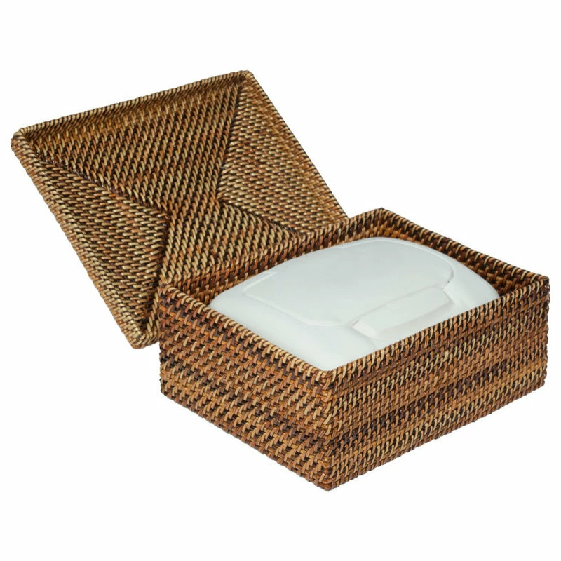 If you like to keep your bath- or powder room neat and decorated without compromises, consider hiding your plastic box or bag of wet wipe refills in this tightly woven box. That way your wet wipes box can stay in plain sight and within reach. This works also with most baby wipe brands.