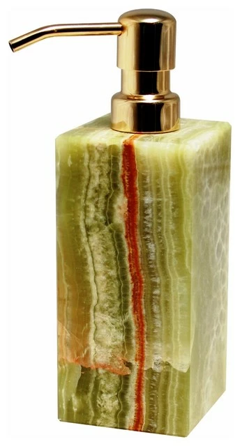 Keep your hands clean and your bathroom counter looking sleek and stylish with our Myrtus Whirl Green Onyx Soap Dispenser on display. Crafted from natural onyx, this chic accessory comes complete with a brushed silver or gold pump to match existing hardware in your bathroom.