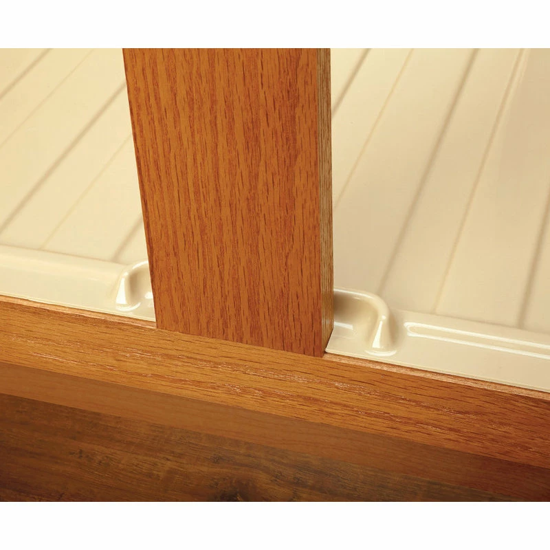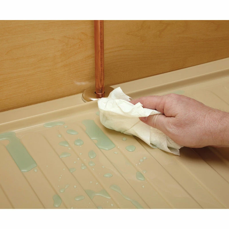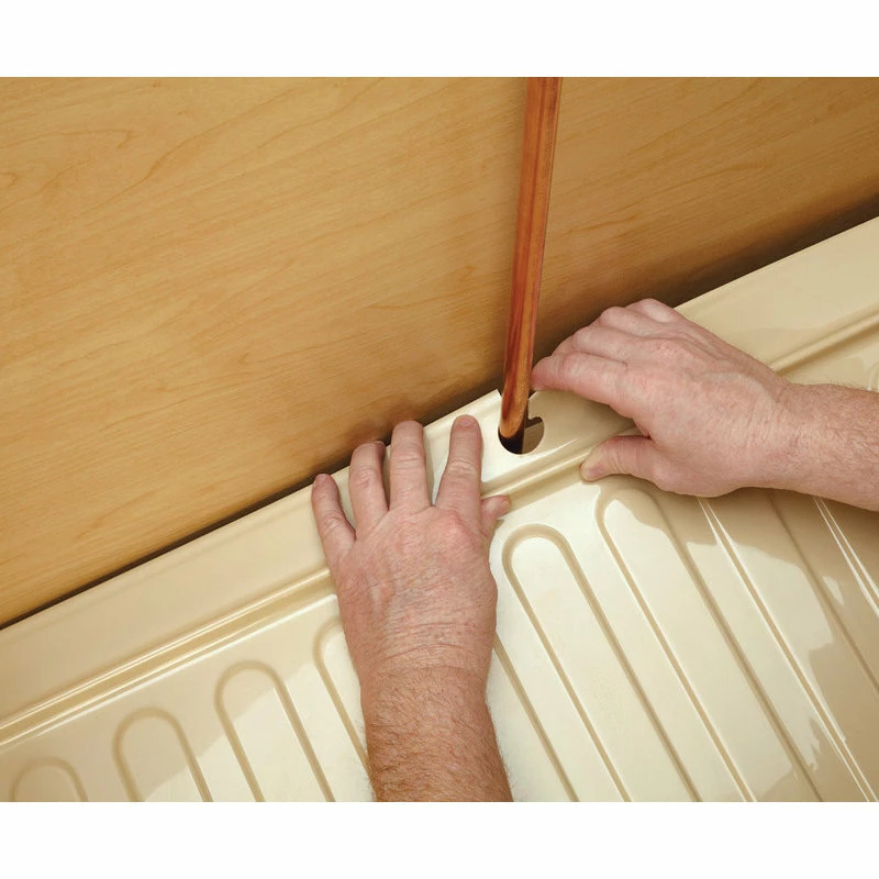 Protect your valuable vanity cabinetry and be alerted of leaks and spills with a versatile and simple to install drip tray. This trimmable cabinet projection device keeps moisture resulting from minor leaks and spills from reaching your cabinetry, and if extensive water builds up, the water is funneled onto the floor so you can fix the problem before it worsens.Features: