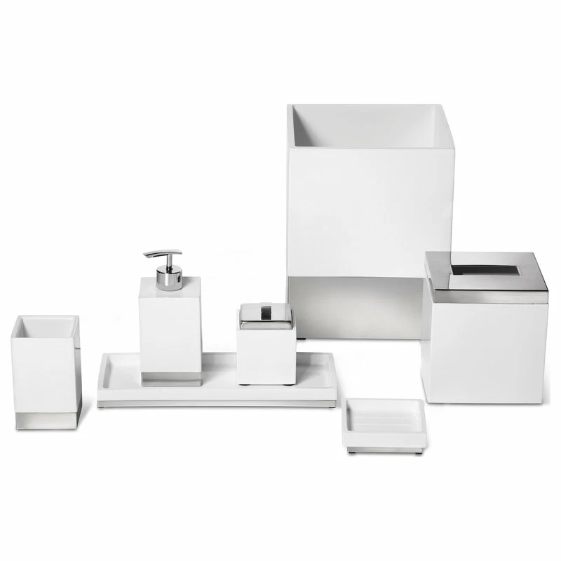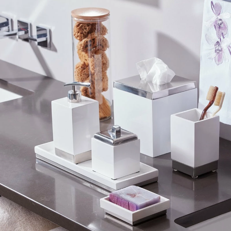 Upgrade your average tissue box with the Roselli Trading Company Suites Bath Tissue Cover. Featuring a white resin base and stainless steel top, this square tissue box makes a sleek, discreet addition to a desk or bathroom vanity. Pair it with other elements of modern bathroom design for a cohesive feel.