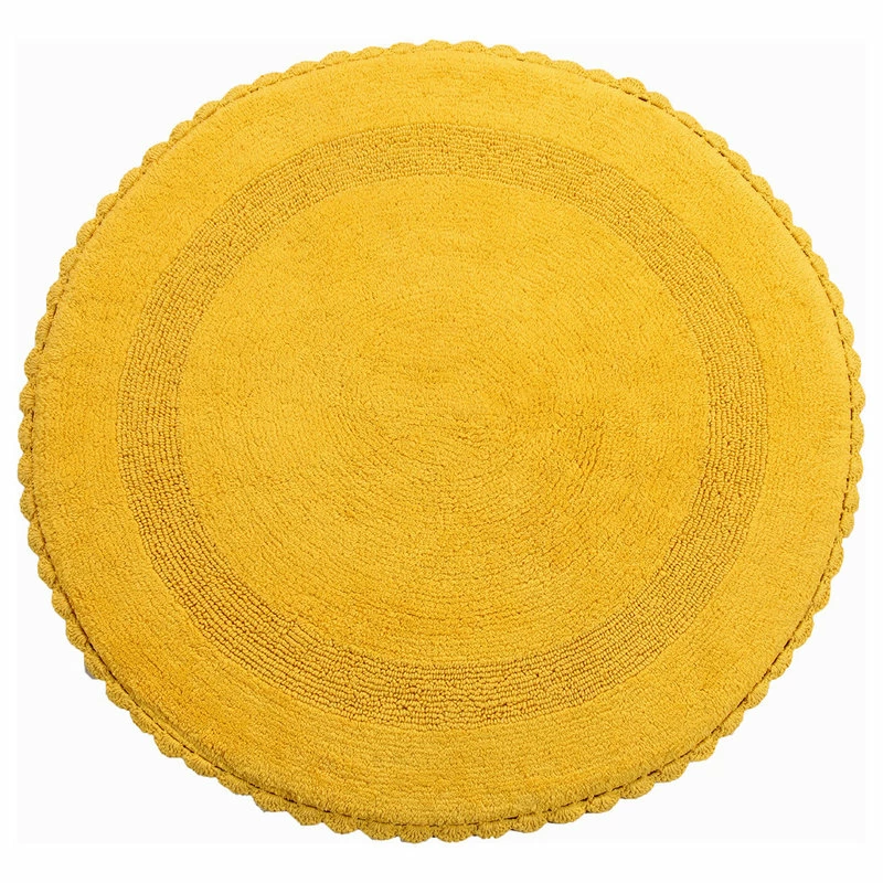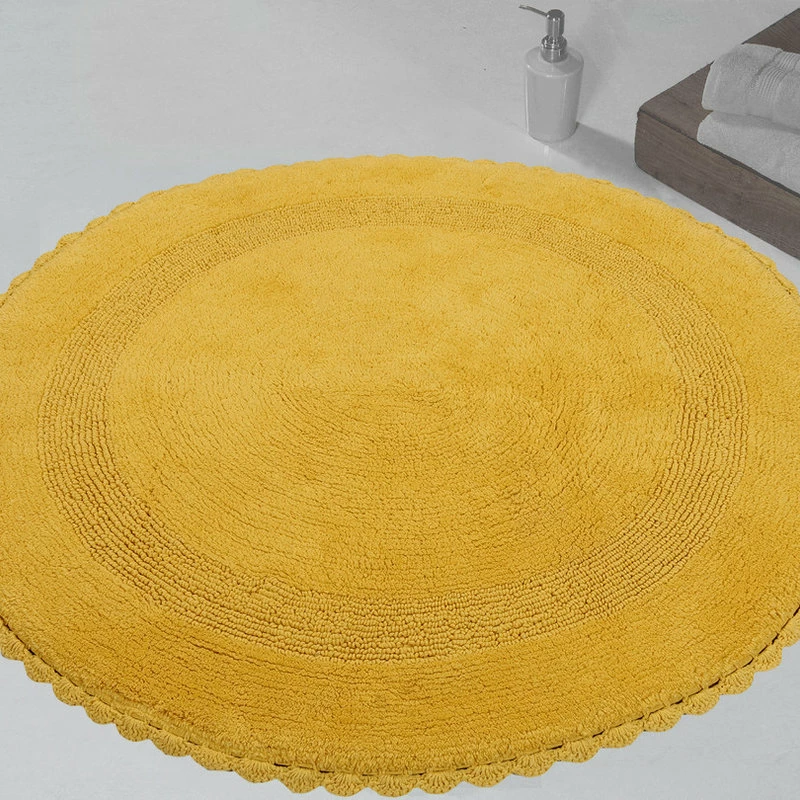 Size – 36 Inch Round. 100% soft Cotton, Reversible Textured Pattern. 36 Inch Diameter. Hand Knitted Crochet Lace Border. Machine washable and dry able. Superior high quality hand tufted durable construction. 200 GSF ‘grams per square feet’ thickness/weight. Decorate your bathroom with this Saffron Fabs Crochet Lace 36 Inches Round Bath Rug, this rug is available in many colors such as arctic blue, beige, chocolate, grey, ivory, light aqua, sage green, yellow and white. This rug features a Handmade Crochet Lace Border that adds a luxury, relaxed feel to your bathroom. This rug is mode of 100% soft Cotton to provide higher water absorbance, perfect for bathrooms as these soaks water quickly. Thick pile texture enhances its softness. These rugs are dyed with Eco-friendly colors using sustainable AZO free dyes. Saffron Fabs bath rugs can be used as area rug in Kitchen, Bedroom, Hotels, and SPA etc. These rugs are machine washable, cold separately; gentle cycle. Do not pull long yarn ends; trim with scissors. It is recommended to use a rug pad underneath, although heavy rugs do not slip due to their weight. Please do not select thick (heavier GSF) rugs if door opens on top of rug as it may cause issues opening the door. Most cotton rugs are handmade in different lots, therefore there might be some variance in color/ size/ design. Also, rugs are folded after manufacturing to put on cartons for shipping, and many times crease/fold line are very visible, which will settle after some period of usage.