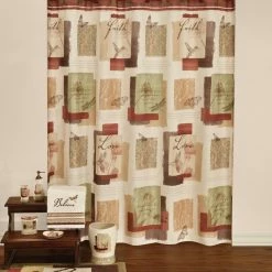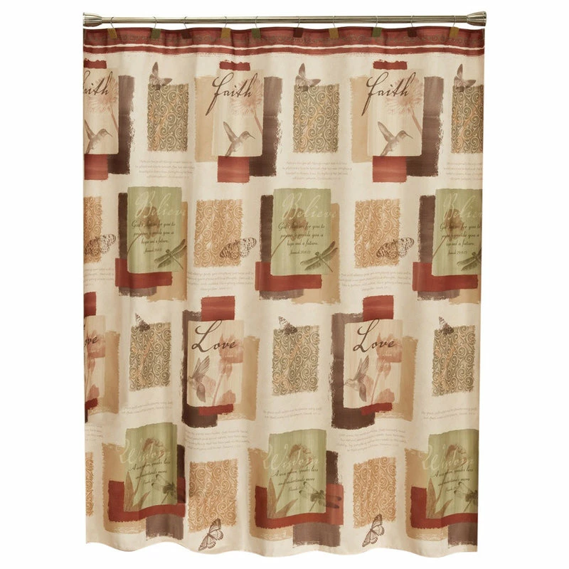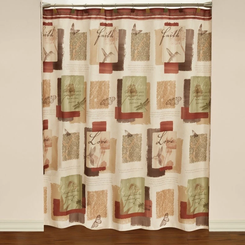 Give your bathroom a makeover with the Inspire bath collection. It features uplifting positive sentiments of faith and love. Shades of soft tans, creams, chocolate, and burgundy combine with dancing butterflies, dragonflies, hummingbirds and a leaf design to create this amazing, inspirational pattern. The shower curtain is printed polyester.