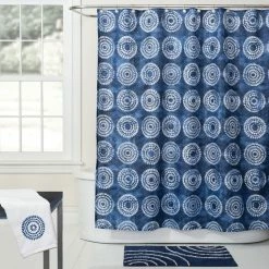 Waterfall shower curtain is printed polyester in a deep ocean blue with a repeating pattern of swirling white rings. A view from the base of a cascade; the Waterfall collection is full of swirls and ripples on deep blue palettes. Enjoy the serenity of the falling water with the entire waterfall collection.