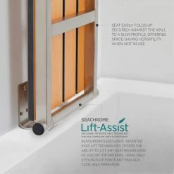 Seachrome’s end-hung/mount folding tub seat measures 32″ L x 13.5″ W, supports up to 250 lbs., and meets all ADA code requirements when properly installed. The seat is automatically held in a raised position 3″ against the wall by a stainless hinge bracket attached to the rear of the tub seat. It is crafted from the durable, water-resistant teak phenolic top with 3″ slats for drainage and #304 stainless steel frame ideal for long-lasting use, is proudly made in the USA with 100% recyclable material and LEED compliance.