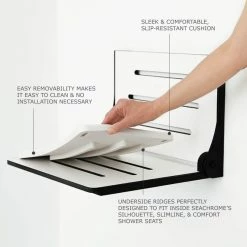 A sleek and comfortable addition to any of Seachrome’s Slimline, Silhouette, and Comfort Shower Seats available in complimentary colors of Almond, Silver, Black, and White. This seat pad provides comfort and safety while adding sophistication to every unique bathroom. With safety being a priority, the seat pad offers a comfortable textured surface that makes it slip-resistant. Not only is it also easy to install, but with no need for adhesive sticking, it makes it easy to remove and accessible to clean while always being safely secured while showering offering peace of mind.