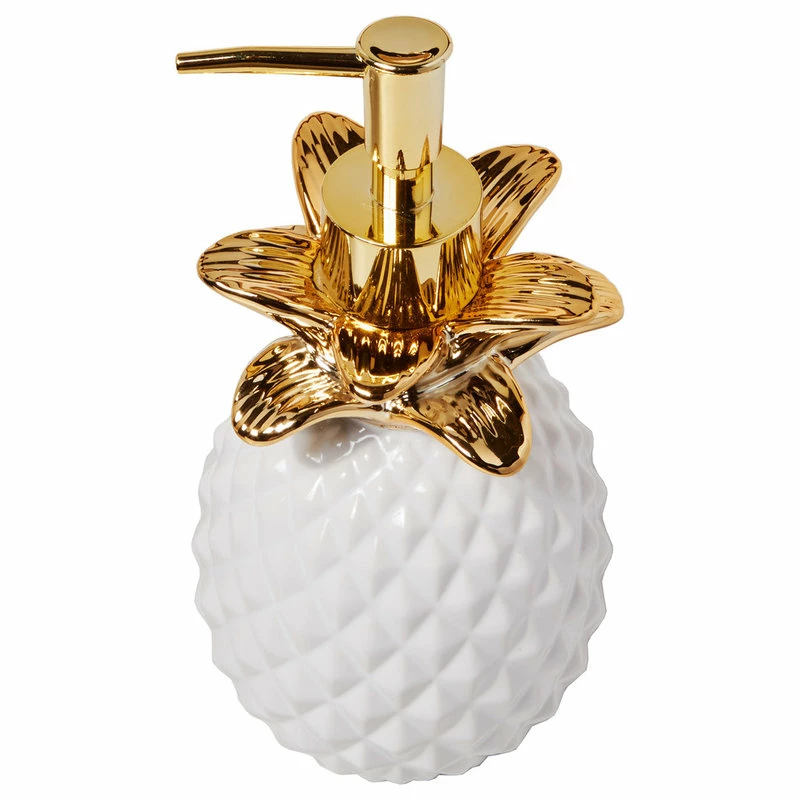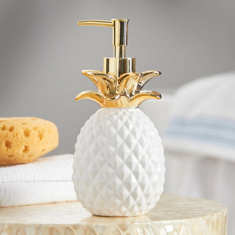 Add a regal touch to the powder room with the Gilded Pineapple lotion dispenser. The bright white high gloss ceramic body is complemented with a bright gold electroplated top. This three dimensional majestic lotion dispenser can be used alone or with the rest of the Gilded Pineapple bathroom ensemble.