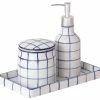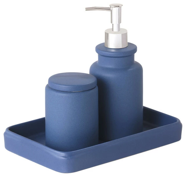Add the finishing touches to your bathroom decor with this 3-Piece Skylar solid color ensemble from Sparrowhawk International. Each piece is hand finished with our window pane motif. The color is designed to coordinate with the Skylar 3-Piece solid Blue completer set, reversible towels, shower curtains and reversible rug colors. Set contains (1) each tumbler, soap dish, toothpaste holder, lotion dispenser and tissue cover.