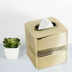 Turn a practical item into a pretty one using the Jewel Boutique Tissue Box Cover. Made from brushed gold metal with a ridged design, this square tissue box is minimal and chic. Display it alongside other pieces from the Jewel bath collection for a cohesive look.
