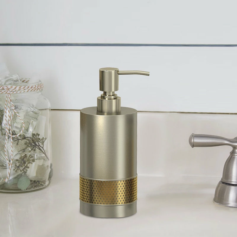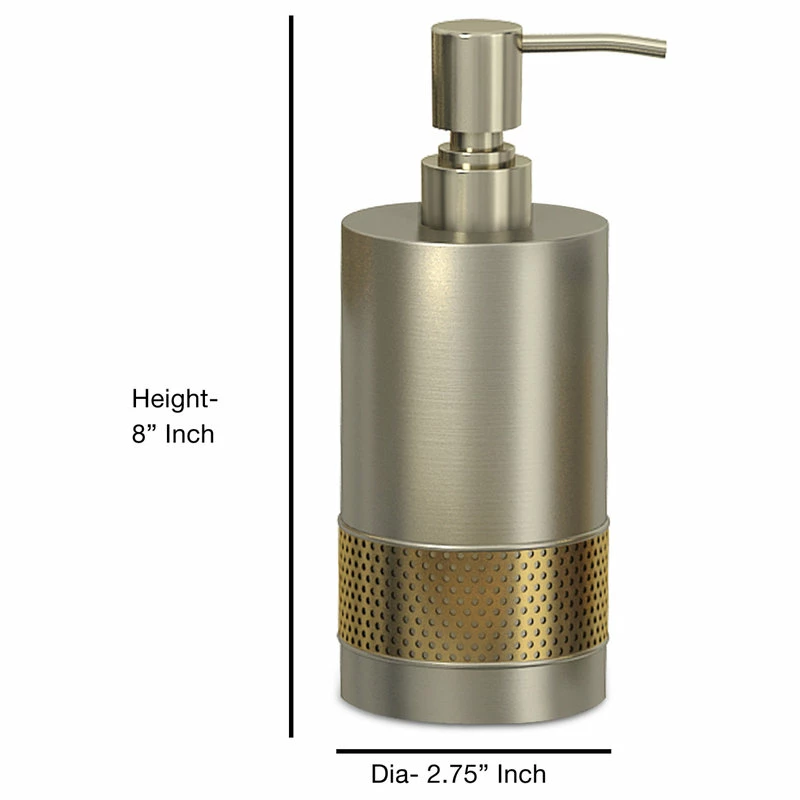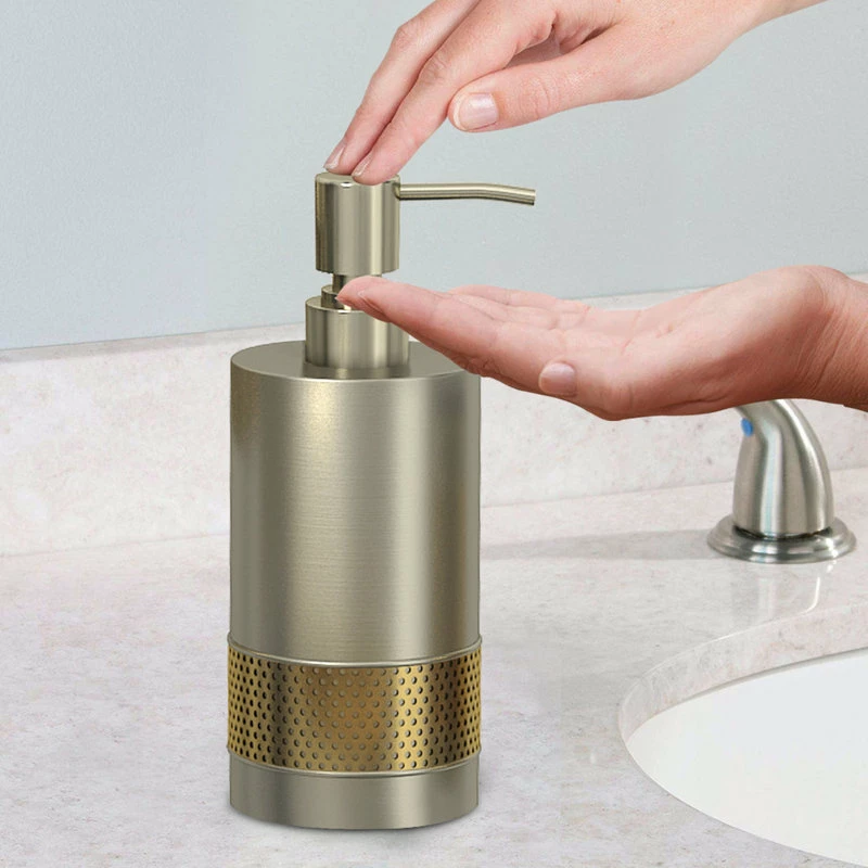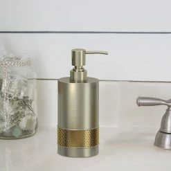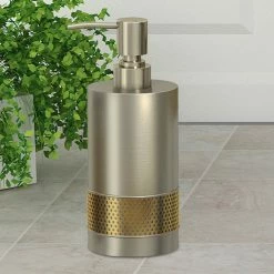 Swap out your plastic soap dispenser for the Selma Brushed Aluminum and Gold Soap/Lotion Pump. Made from perforated gold metal and brushed aluminum, this cylindrical dispenser is contemporary and cool. Display it alongside other pieces from the Selma Brushed Gold bath collection for a cohesive look.