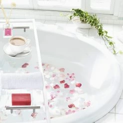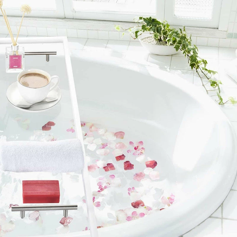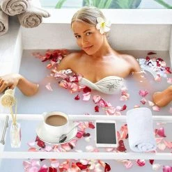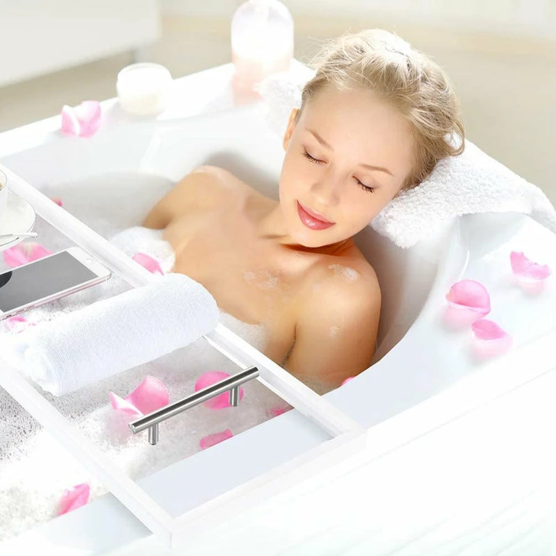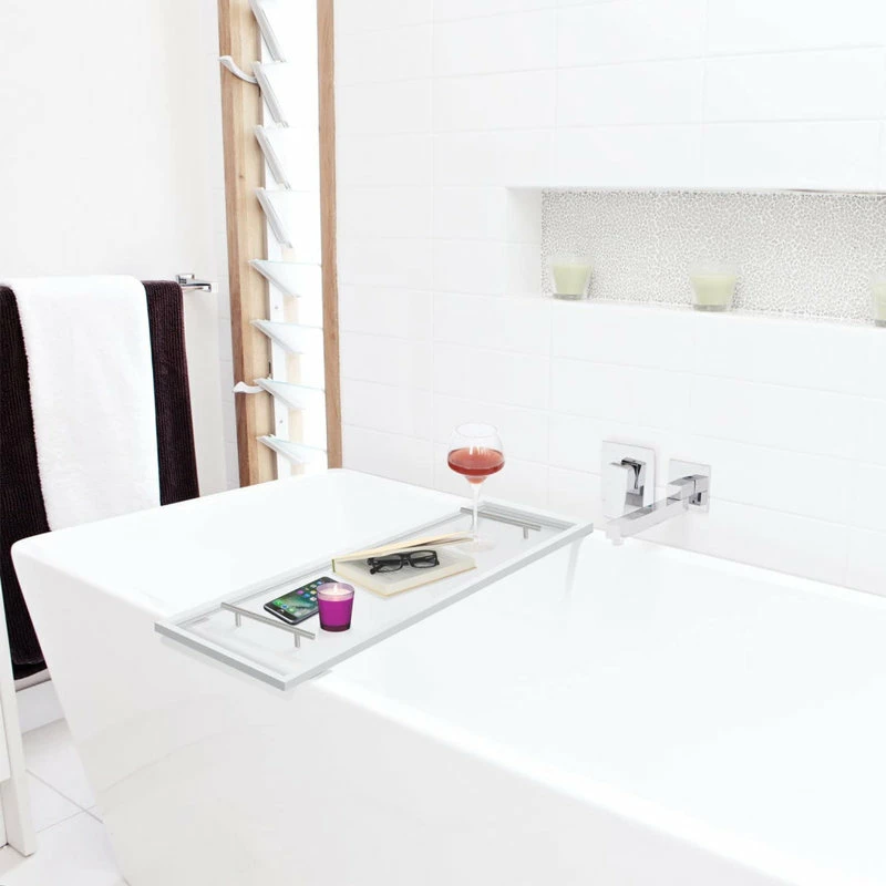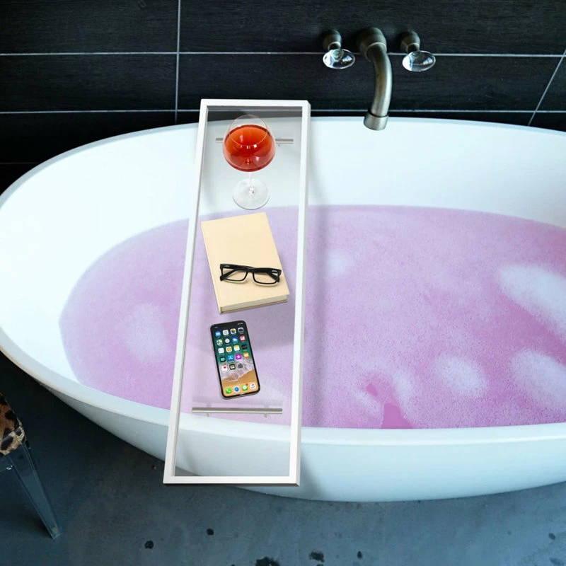 If you love reading a great book and soaking in a warm bubble bath while sipping a drink and having a place to set your mobile phone nearby, then you’ll love our best acrylic tub caddy! The strong, clear, see-through acrylic surface lets you enjoy colorful bath bombs or bubbles and the smart design of this large portable bathroom rack is a great addition to a relaxing luxury bath where you can keep your e-reader, tablet, and cell phone close by. There is even room for your favorite beverage too! Designed to last, you’ll appreciate the generous size of this sturdy caddy. With room to set your grooming supplies, such as razors, shaving cream, tweezers, a mirror, fingernail clippers, and more; it’s easy to relax while bathing when you have what you need nearby. High-quality stainless steel and rust-proof handles add an elegant design accent while also being functional. Clear acrylic design is perfect for any decor as it seamlessly blends into any bathroom style. This caddy is 33 inches long and 9 inches wide, and fits most bathtubs; convenient handles make it easy to place the caddy across your tub and it won’t scratch the bathtub’s surface. It’s the perfect gift for the bath lover in your life. The ToiletTree Clear Acrylic Bathtub Caddy elevates your bathing experience to one of escape, comfort, and full of enjoyment. There’s room to hold a variety of items or accessories, including a towel, soap, and washcloth, or maybe a great book to read, your smartphone, and a cup filled with your favorite beverage. Makes a cute and unique gift for a wedding shower or new mom when you pair it with bath salts, a candle, and a bottle of wine. Order one for each bath in your home today to keep all your necessities organized when you are soaking your cares away in a hot bath.