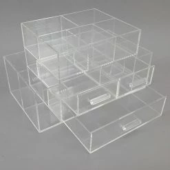 The OnDisplay Tiered Cosmetic Organizer neatly stores all your makeup in one simple and awesome design. Constructed of heavy-duty clear acrylic, the 7 Tier Cosmetic Organizer features 6 pull-out drawers each measuring 11.5″ wide and 11.5″ deep. The top level of the organizer has a lift-up lid to store frequently used cosmetics in a simple-to-access location. The entire unit measures about 12″ x 12″ x 18″ tall.