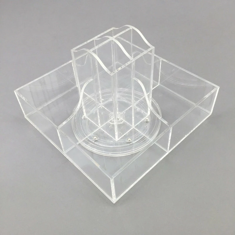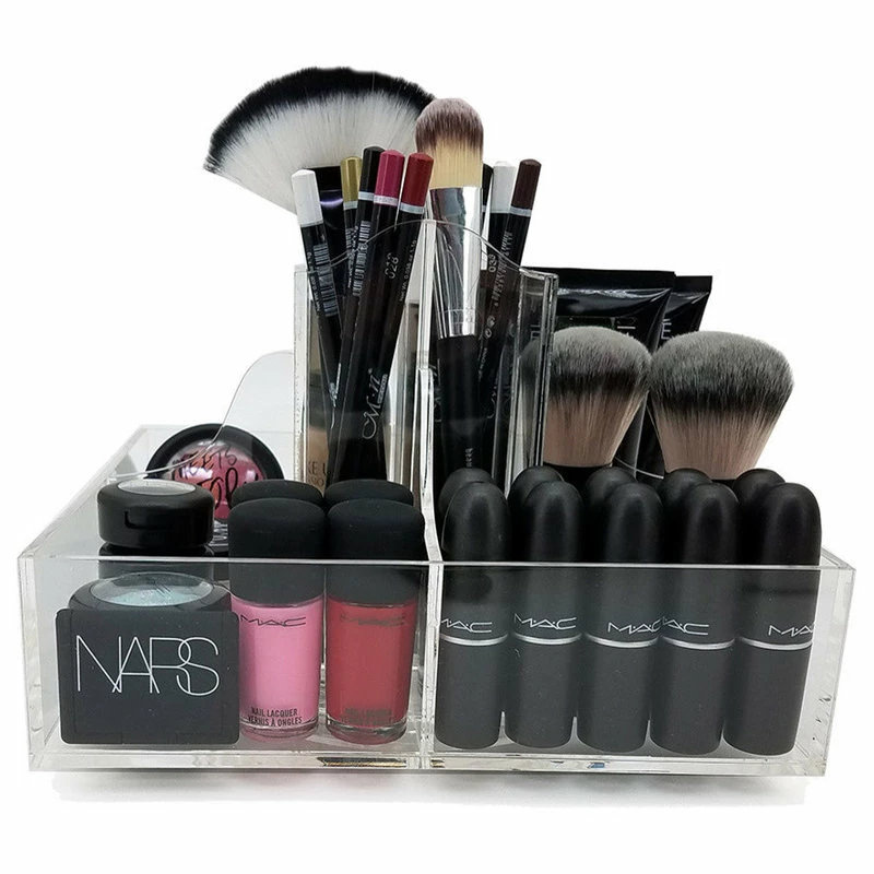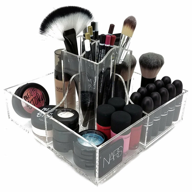 Constructed of heavy duty clear acrylic, the Abby Rotating Cosmetic Organizer Tray is completely hand assembled and features a rotating base allowing you to turn and view your cosmetic assortment in 360 degree rotation. Features 4 storage bins on each corner along with a tall central storage bin for your brushes, combs and other taller cosmetics. Overall height is 5.5″. Width is 8.7″ and depth is 8.7″. Perfect for the ultimate diva!